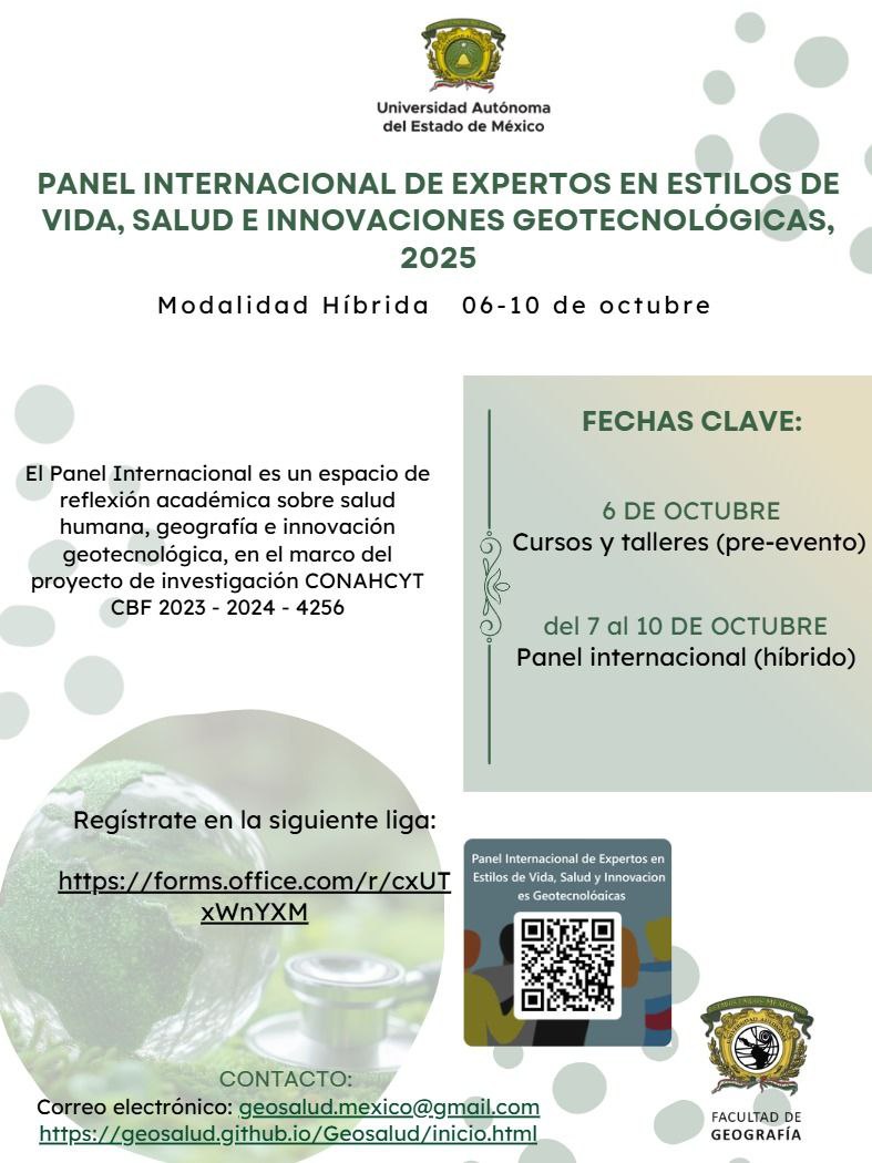 ¡Particiapa en la encuesta!Entérate y participa "Panel internacional de expertos en estilos de vida, salud e innovaciones geotecnológicas" (modalidad híbrida), del 06 al 10 de octubre, 2025. Sigue la transmisión en Facebook